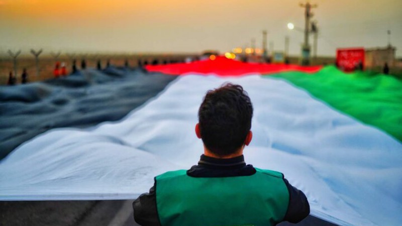 بزرگترین پرچم فلسطین در کشور که چندی پیش با حضور خانوادههای شهدای غزه در منطقه فرهنگی و گردشگری عباسآباد به اهتزاز درآمد در مرز چذابه به همراه زائران حسینی مشایعت شد.