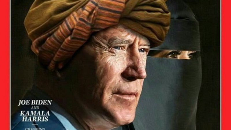 در این تصویر ساختهشده بایدن به سبک مردان طالب، دستار به سر دارد و معاون او – کامالا هریس - هم مانند زنان طالبان برقع پوشیده و تنها چشمهای او پیداست.