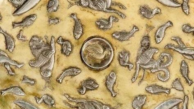 به گفته او، این بشقاب متعلق به اواخر دوره ساسانی (قرون ۶ و ۷ میلادی) است که دارای پایه حلقوی در زیر است و رویه بیرونی آن، صاف و دارای خوردگی زیاد است. نقوش برجسته روی بشقاب با کندهکاری زمینه ایجاد شده است و فقط مدال کوچک در وسط بشقاب، جداگانه ساخته و به آن افزوده شده است. هنرمند داخل بشقاب را مانند دریایی به تصویر درآورده که پر از ماهی، اردک و موجودات افسانهای است. در چهار گوشه لبه بیرونی، یک قایق با دو ماهیگیر دیده میشود. برخی از ماهیگیرها، پاروهای بلندی برای به حرکت درآوردن قایق و برخی قلاب یا تور برای شکار ماهی در دست دارند و ماهی در سبدهایی آویخته به پشت ماهیگیران یا درون قایق نگهداری میشوند. ماهیگیران بالاتنهای برهنه دارند و فقط یکی از آنها به طور کامل لباس پوشیده است و کلاهی نوکتیز بر سر دارد. چهار موجود افسانهای بالدار شامل حیواناتی همچون قوچ، اسب، شیر و بزکوهی با بدن ماهی دور مدال مرکز بشقاب قرار گرفتهاند. روی مدال، یک کبک دیده میشود که یکی از نقوش رایج در اواخر دوره ساسانی است. این نقشها در هنر فلزکاری منحصر به فرد است.