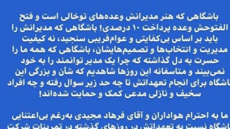 به گزارش همشهری همانطور که پیش بینی می شد صبر بازیکنان و کادر فنی استقلال در خصوص وعده های سعادتمند به سر آمد و بعد از اعتراض فرشید اسماعیلی وحمایت فرهاد مجیدی از او در نهایت تمام بازیکنان استقلال تصمیم گرفتند تا با پستی مشترک نسبت به وضعیت این روزهای باشگاه نارضایتی خود را به گوش وزیر برسانند.